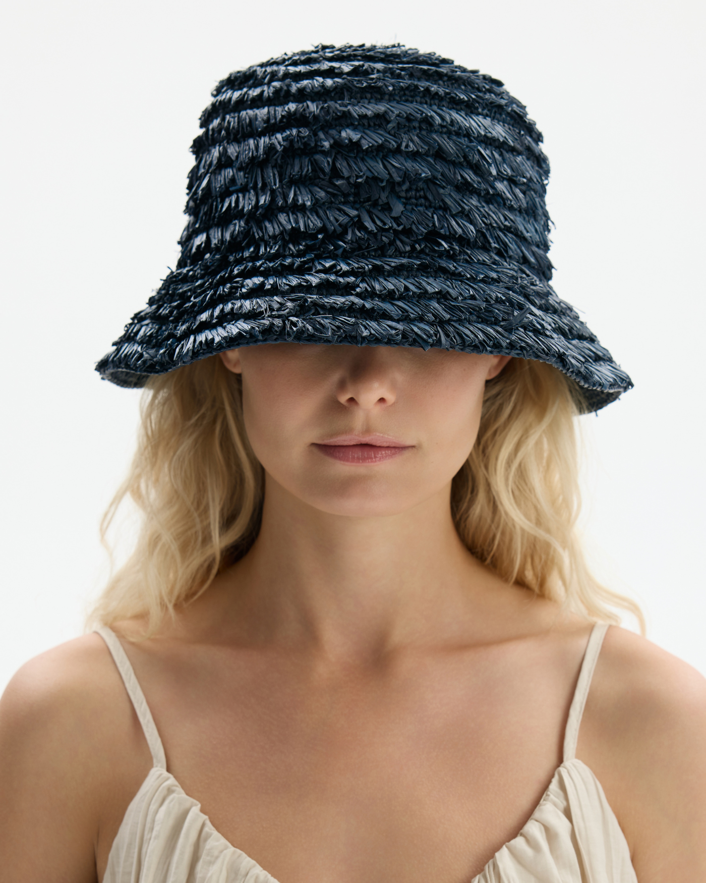 Bucket Bibi został wykonany na Madagaskarze z naturalnej rafii o wyrazistej, postrzępionej strukturze. Jego klasyczna sylwetka łączy swobodę z wyraźną formą. Średniej wysokości korona oraz proporcjonalne rondo zapewniają komfortową ochronę przed słońcem, tworząc codzienny model o naturalnym, rzemieślniczym charakterze.