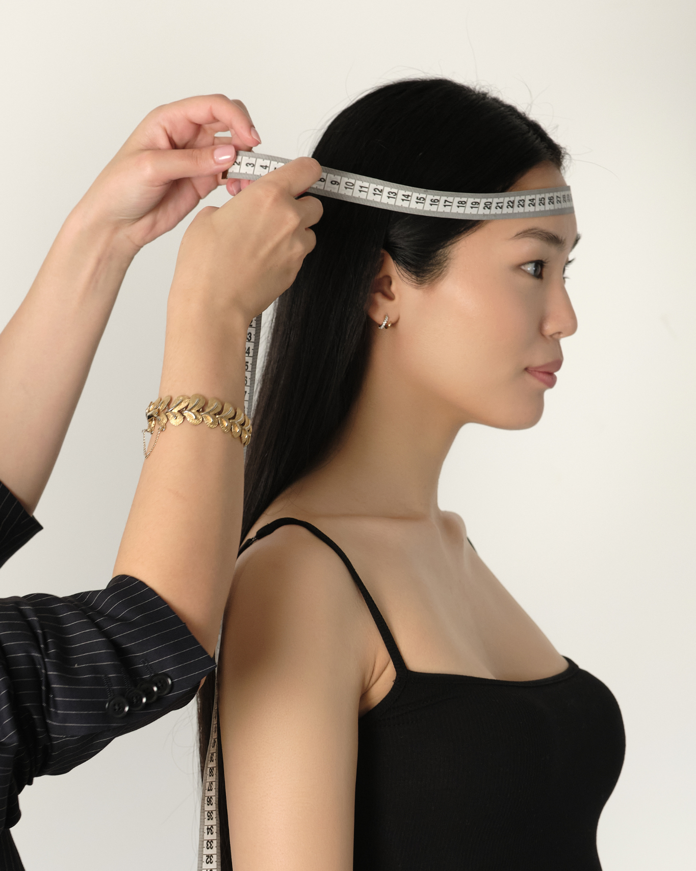 2. Stand in front of a mirror and gently wrap the tape around your head – 1 cm above your eyebrows at the widest part of your head. Do not pull it too tightly.